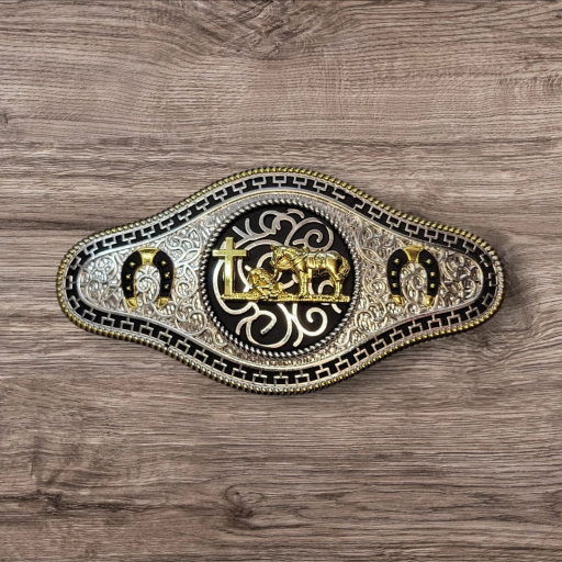 Charro Belt Buckle – Christian Cowboy/Horse Shoe 6.5″x3.25″ Silver/Black/Gold