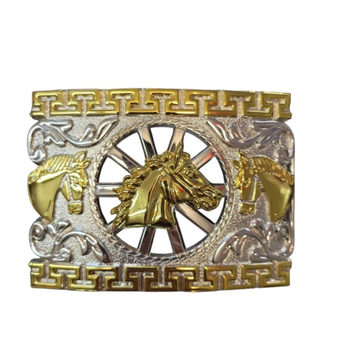 Cowboy Belt Buckle – Horse Head/Horse Shoe 4.25″x3″ Gold Tone/Silver/Black
