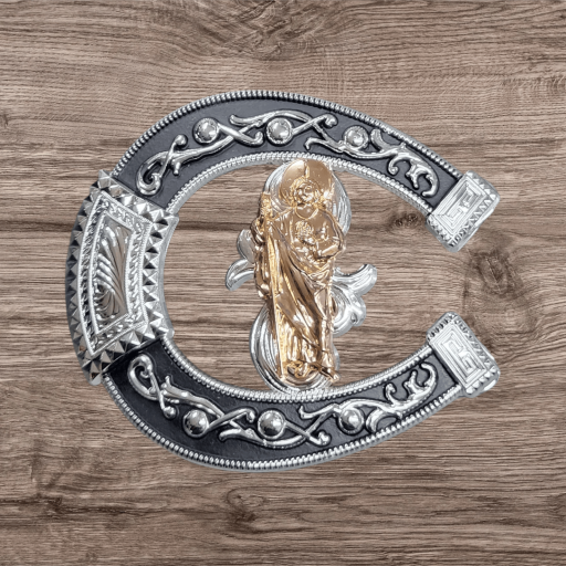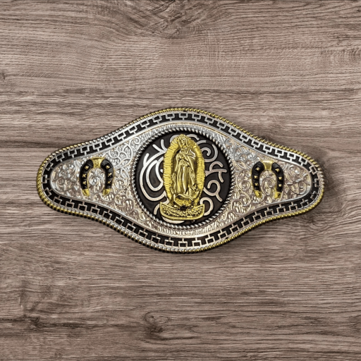 Cowboy/Charro Belt Buckle – Virgen Mary/Horse Shoe 6.5″x3.25″ Silver Tone/Black/Gold