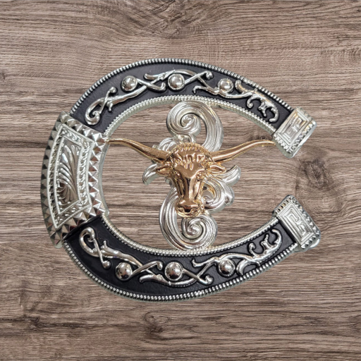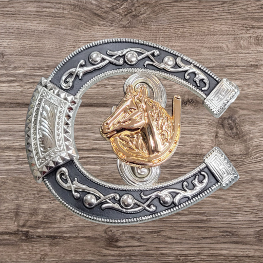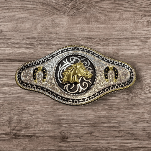 Cowboy/Charro Belt Buckle – Horse/Horse Shoe 6.5″x3.25″ Silver Tone/Black/Gold