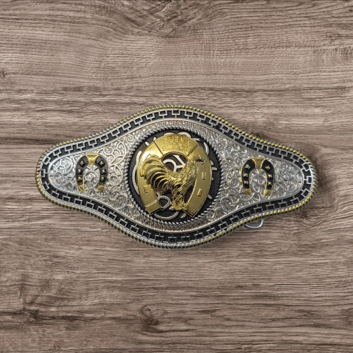 Cowboy/Charro Belt Buckle – Rooster/Horse Shoe 6.5″x3.25″ Silver Tone/Black/Gold