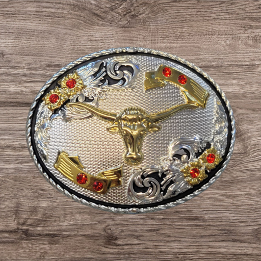 Cowboy Belt Buckle – Long Horn Bull Head 4.25″x3″ Gold Tone/Silver/Black