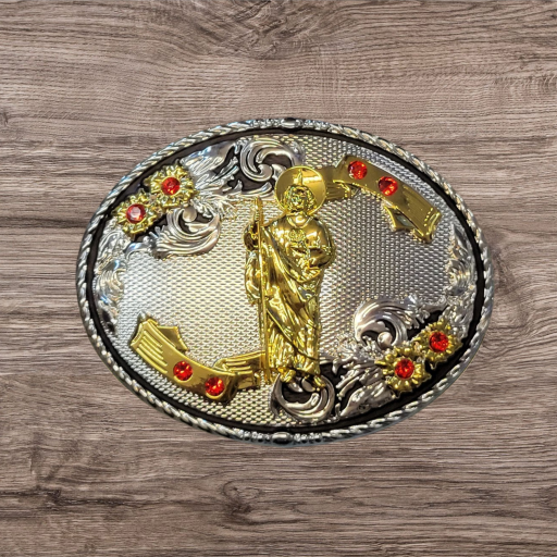 Cowboy Belt Buckle – Saint Jude 4.25″x3″ Gold Tone/Silver/Black