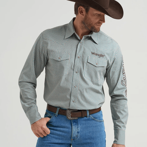 Men’s Wrangler Retro® Premium Long Sleeve Modern Fit Snap Shirt – Turq/Brown 112368058