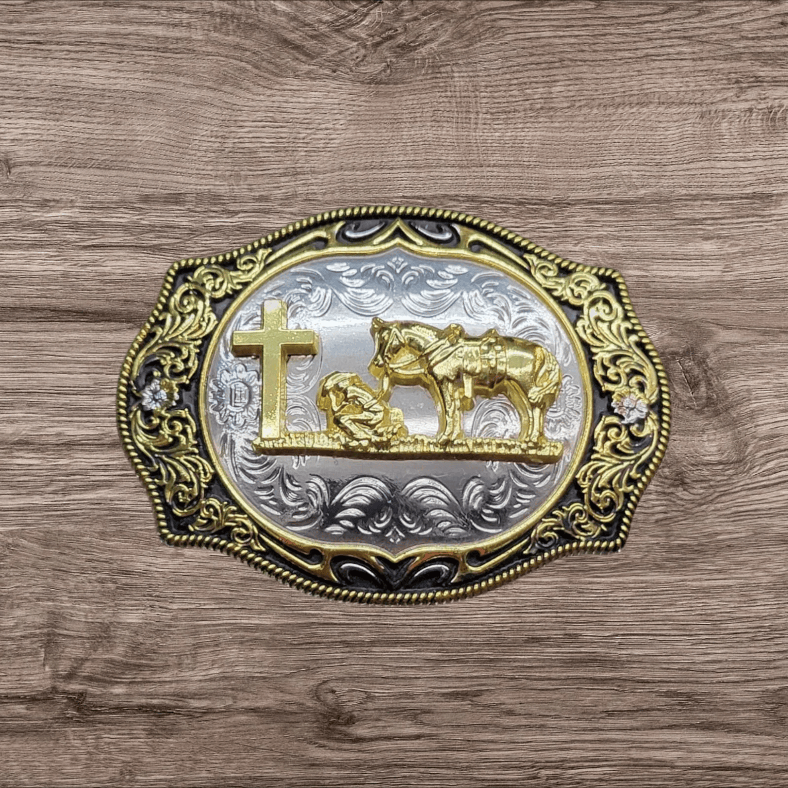 A stunning polished chrome buckle. Traditional Western design.