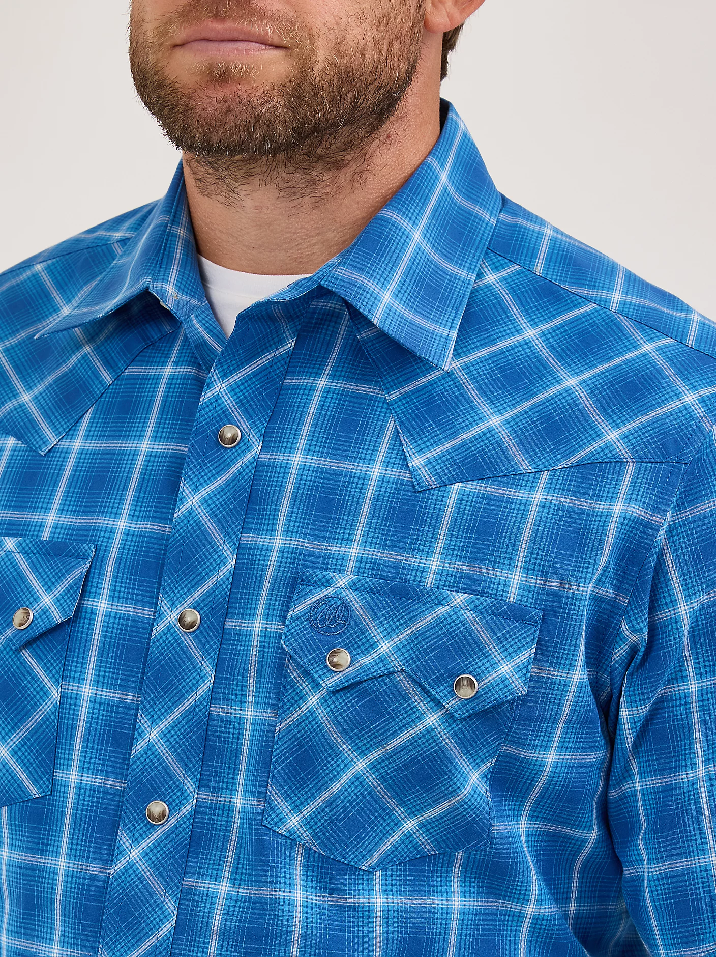 Paying tribute to our Western roots, the men’s Wrangler Retro® long-sleeve sawtooth snap pocket western shirt gives the classic style you know a modern look and feel. It comes with all the same details you love, including a spread collar, pointed yokes, and two sawtooth snap flap pockets with embroidery to add a bold element to every outfit. Plus, it features a modern fit and it’s crafted from cotton for comfort and long-lasting durability, no matter how often you wear it. Wear it with a pair of Wrangler Retro bootcut jeans to complete the look for any occasion.