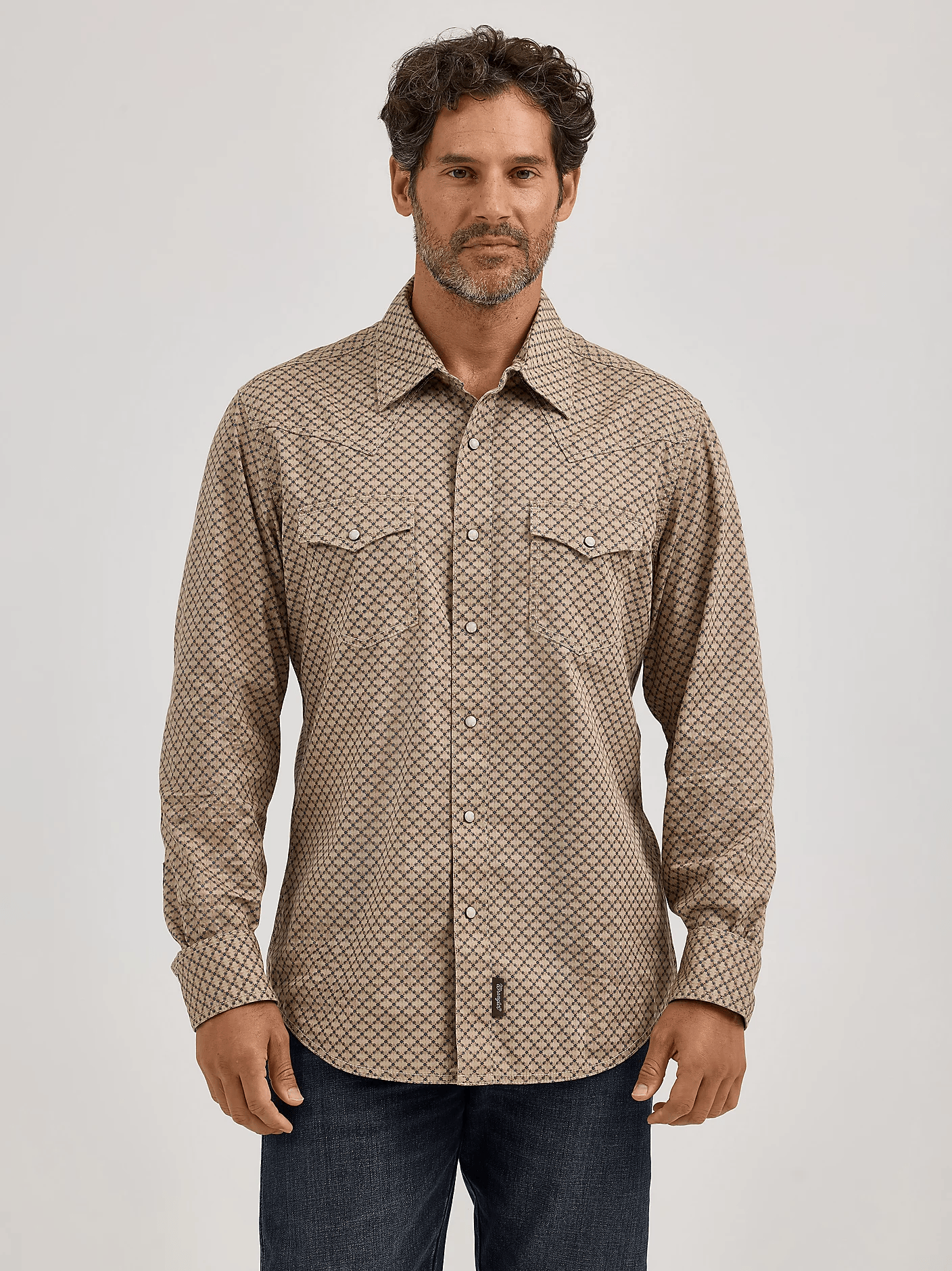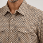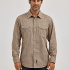 Look good while feeling good in the men’s Wrangler Retro® long-sleeve western snap printed shirt. This contemporary take on the classic style you love comes packed with all the distinctive details, including pointed front and back yokes, single-needle stitching at the placket, modern fit, contrast trim, two snap cuffs, and two chest flap pockets with snaps. This long-sleeve snap shirt features a modern fit and it’s crafted from cotton for comfort, minimal wrinkling, and long-lasting looks. Complete the outfit with Wrangler Retro jeans.