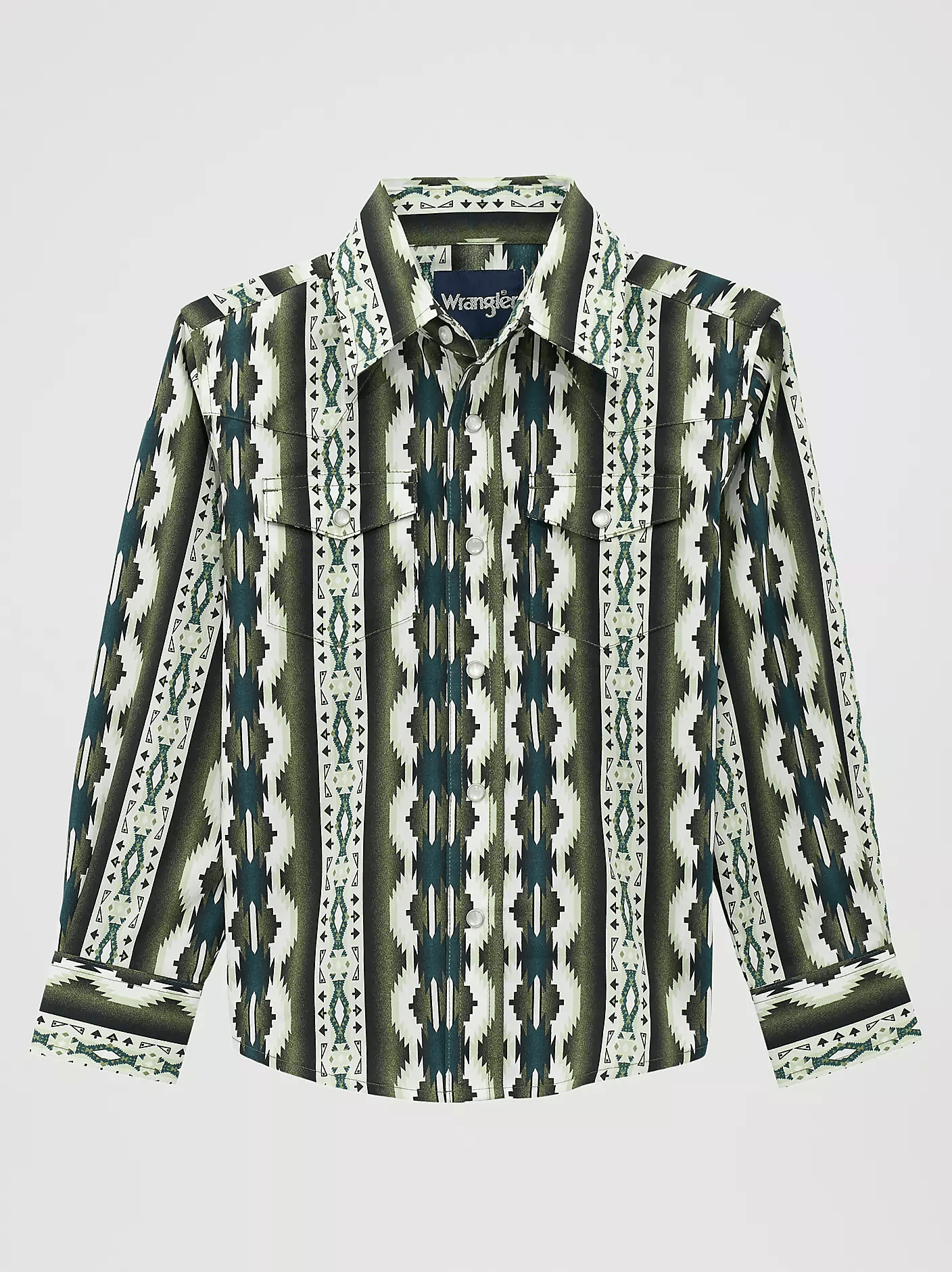 A desert-print motif keeps the frontier spirit alive on this tailored shirt for your little guy. For an authentic cowboy look, it features details such as Western-style yokes, snap closures and flap pockets.