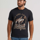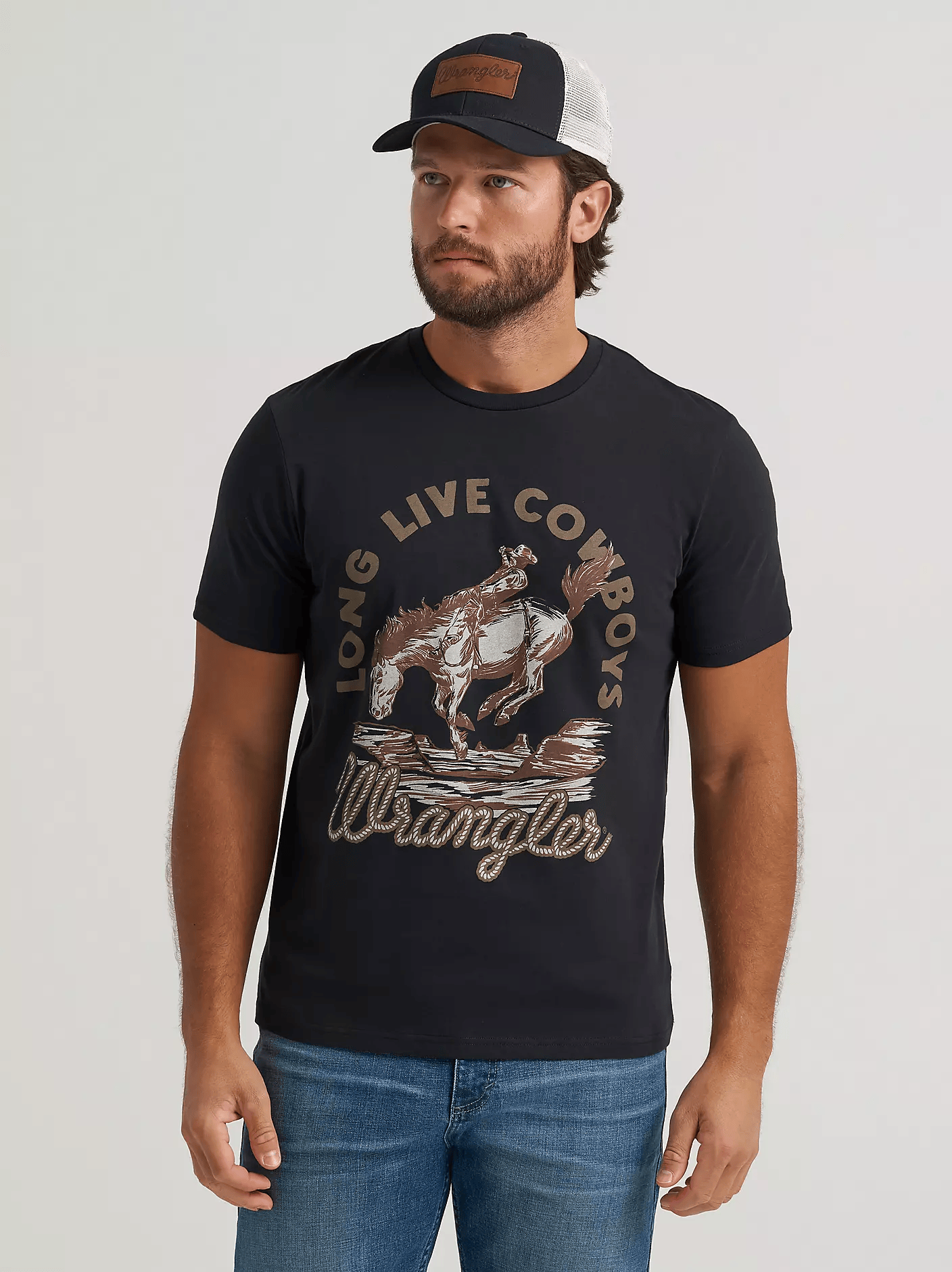 The Sepia Cowboy Graphic T-Shirt brings a quietly powerful, archival feel to your daily rotation. Featuring a bucking bronco and the Wrangler logo, with Long Live Cowboys®® printed above it, this tee stays grounded in Western culture. Its made of 100% cotton in a classic regular fit.