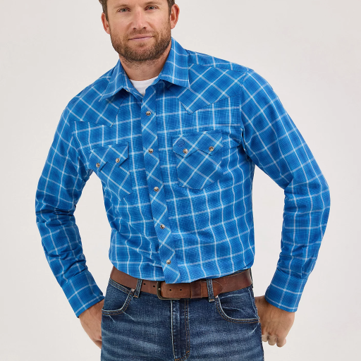 Men’s Wrangler Wrinkle Resist Long Sleeve Western Snap Plaid Shirt – Blue 112369370